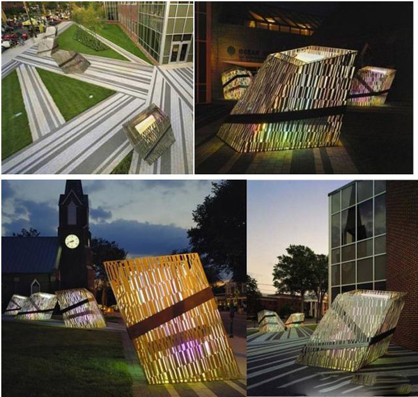 美國(guó)Mikyoung Kim完成了新澤西州海洋縣公共圖書館門前的一系列景觀照明設(shè)計(jì)。這個(gè)由激光切割不銹鋼和玻璃構(gòu)成的景觀燈具,應(yīng)用了條碼圖案來表達(dá)在數(shù)字時(shí)代下信息的傳播。五個(gè)一組的燈具被用激光切割成的鋼鐵包裹在一起,它們既能反射光線,又能從內(nèi)部發(fā)出光芒,從白天到黑夜都有變化。
